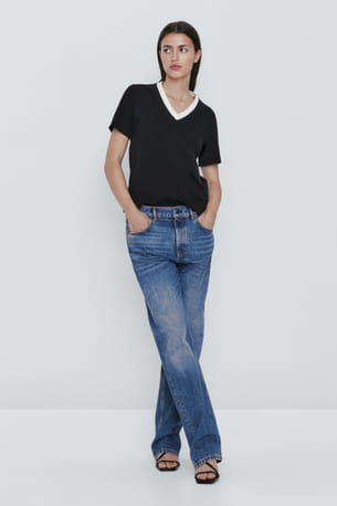 T-shirt en coton encolure en V contrastant © Massimo Dutti