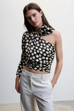 Blouse noir et blanc à pois one shoulder et à fleur de Mango