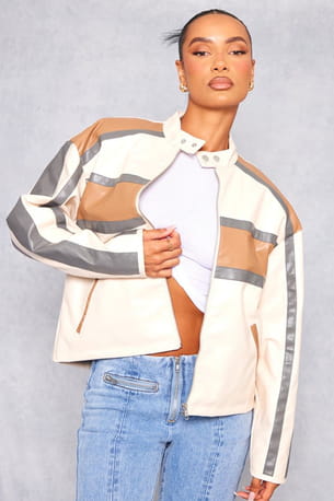 Veste en cuir beige à bandes contrastantes de PrettyLittleThing
