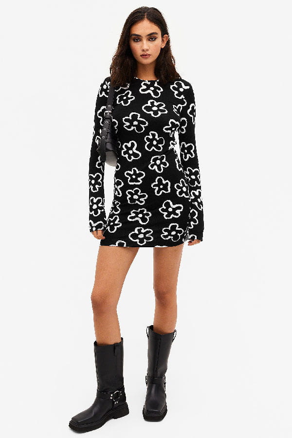 Robe courte en jersey à manches longues imprimée de fleurs blanches de Monki