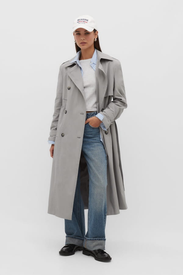 Trench gris long avec ceinture de Stradivarius
