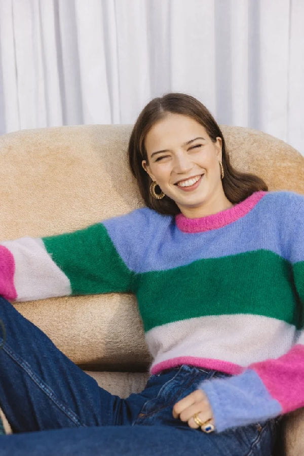 Pull à grosses rayures vert, bleu et rose de Balzac Paris