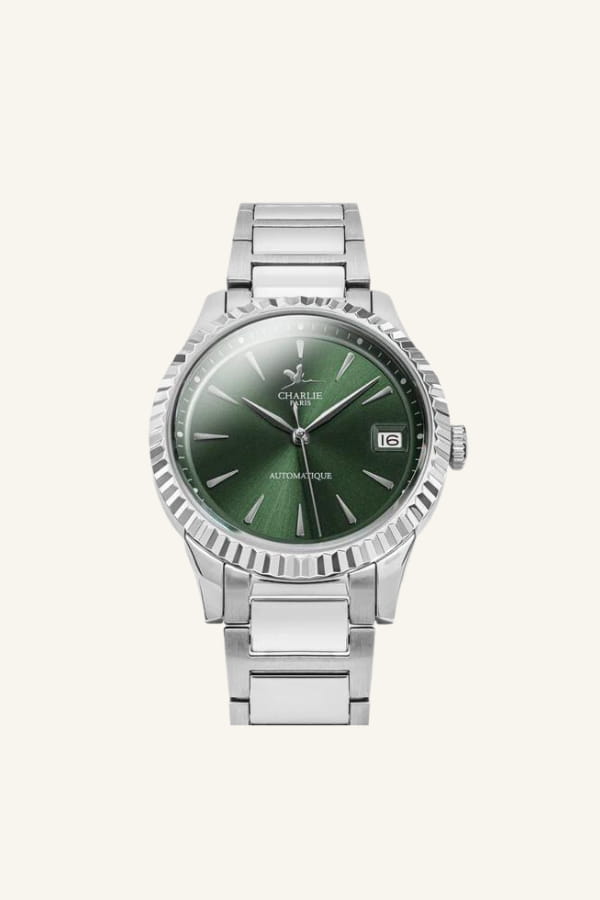 Montre argent et vert intemporelle "Aurore Cannelée" de Charlie Paris