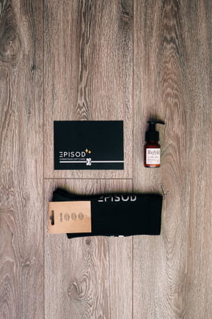 Chaussettes de sport noires de Circle dans la box "Cool People Do Bootcamp" d'Episod comprenant une session bootcamp et un gel pour le corps de Refyll