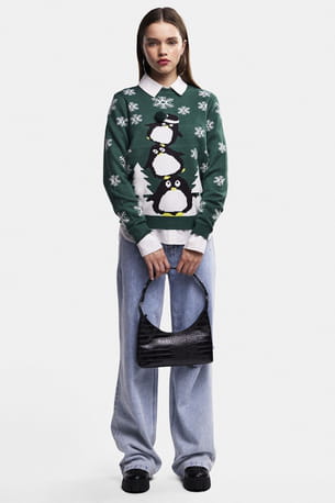 Pull de Noël vert avec pingouins tricotés de Pieces