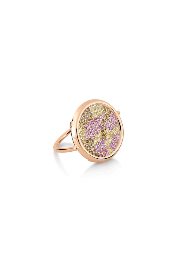 Bague en or rose 18 carats et quartz fumé, topaze rose et topaze jaune "Disc" de Ginette NY