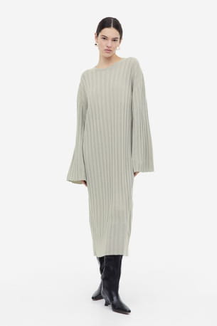 Robe en maille vert clair côtelée midi à manches évasées de H&M
