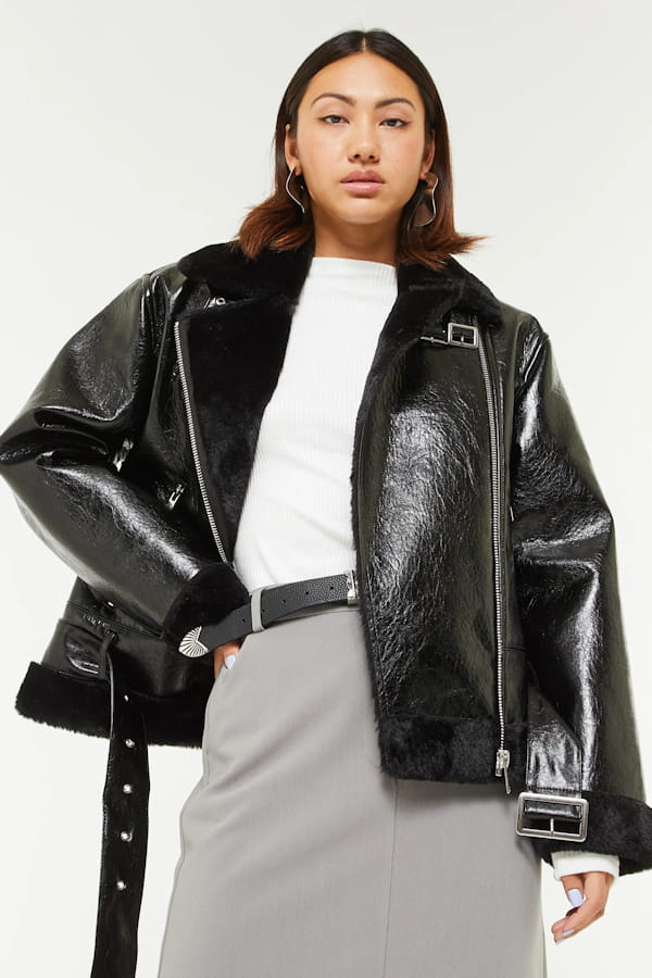 Blouson façon cuir avec doublure fourrure noire de Pimkie