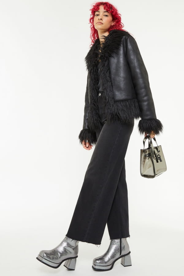 Manteau en similicuir et poils longs