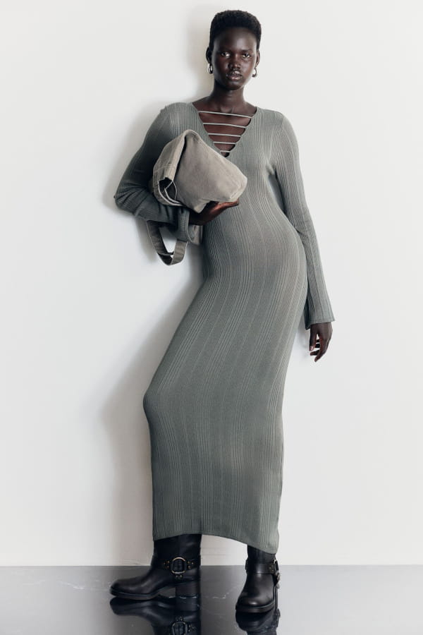Robe longue en maille côtelée grise avec lanières de H&M
