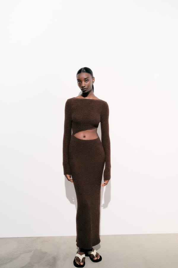 Robe marron longue à texture et détail ajouré de Zara