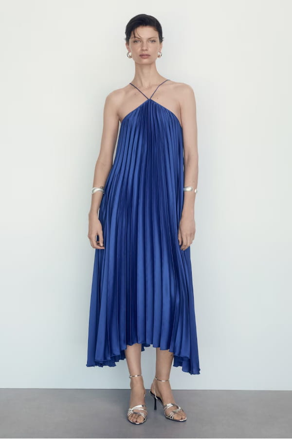 Robe plissée bleu nuit à emmanchure américaine de Mango