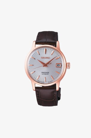 Montre au bracelet en cuir marron et au cadran rose gold et blanc design "Presage" de Seiko