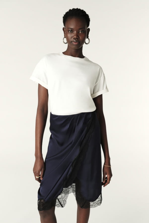 Jupe portefeuille bleu marine avec dentelle "Clémence" de Ba&Sh