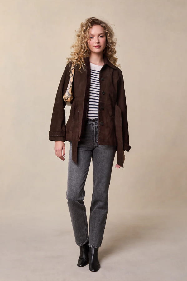 Veste à effet patchwork ceinturée en daim ébène "Josepha" de Rouje