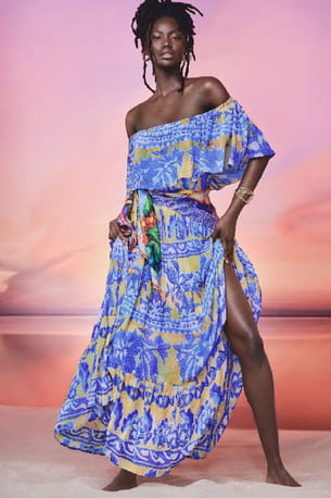 Robe à imprimé bleu et jaune et encolure Bardot de Desigual x Stella Jean