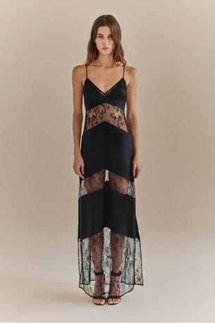 Robe longue satin de soie en dentelle florale à fines bretelles "Dark Sully" de Livy