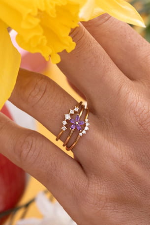 Trio de bagues zircons et fleur améthyste plaqué or © L'Atelier D'Amaya
