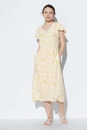 Robe jaune imprimée encolure en V manches courtes de Uniqlo
