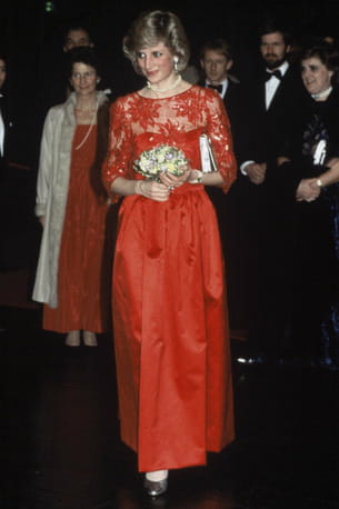 Lady Diana en robe longue rouge au buste en dentelle ©  HUSSEIN ANWAR/SIPA