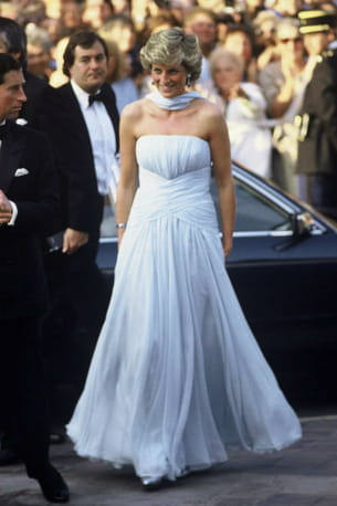 Lady Diana en robe bustier blanche plissée au festival de Cannes le 15 mai 1987.