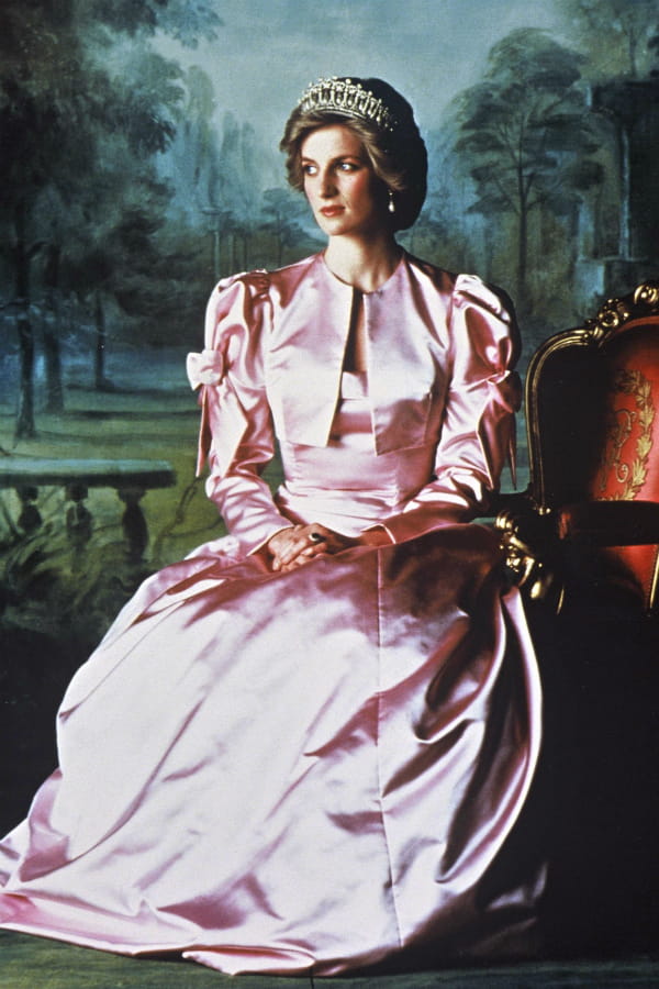 Lady Diana en robe longue irisée rose à manches bouffantes et tiare pour son portrait officiel en décembre 1987.