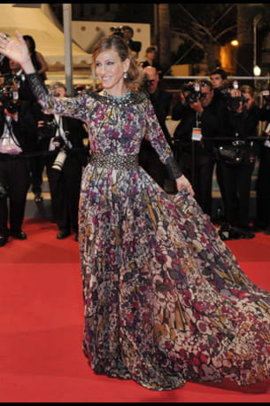 Quand l'inoubliable interprète de Carrie Bradshaw vient à Cannes, c'est dans une robe Elie Saab qu'elle monte les marches. On adore le choix plutôt audacieux de l'actrice avec ce modèle prêt-à-porter automne-hiver 2011-2012 imprimé en crêpe georgette, ajouré de dentelle sur les manches, la taille et le col. Une façon très mode de se faire remarquer pour Sarah Jessica Parker !