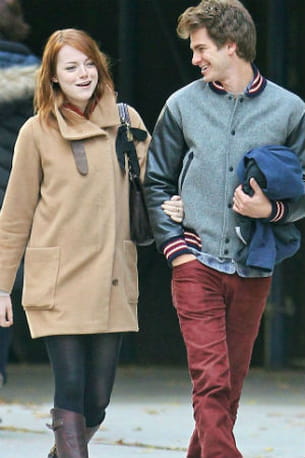 Les acteurs principaux du dernier Spider-Man  ont vécu un coup de foudre sur le tournage du film. Résultat, Emma Stone  et Andrew Garfield  forment un bien joli petit couple. Sur le papier, en tout cas leur idylle a tout d'un scénario hollywoodien. Elle est la star de La Couleur des sentiments  et de Crazy, Stupid, Love , deux succès au box-offce. Le talent d'Andrew a explosé dans The Social Network et Never Let me Go. Deux stars montantes qui ont su également accorder leur style : lui arborant un pantalon rouge et un blouson teddy, deux pièces tendance de l'hiver et elle craquant pour un manteau avec des détails cuir et des bottes cavalières. Un look d'étudiants qui sied à merveille au jeune couple.