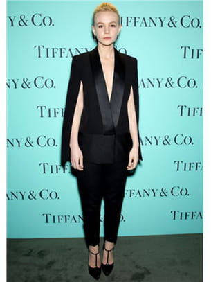En 2013, la jeune femme est devenue l'une des actrices incontournables d'Hollywood avec des films événements comme Drive ou Shame. En matière de dressing, elle maîtrise parfaitement les codes des soirées et du tapis rouge. Ici, elle fait confiance à sa compatriote Victoria Beckham avec un smoking revisité. On aime tout : le profond décolleté, les manches cape et les salomés à bout pointu.