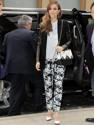Jessica Alba en pantalon imprimé et sac à main bicolore Roger Vivier à New York le 11 mars 2013.