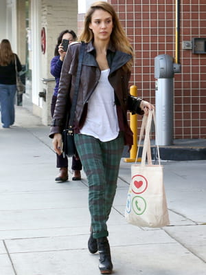 Jessica Alba en pantalon tartan et veste en cuir marron