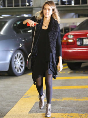 Jessica Alba en total look noir et bottines beiges