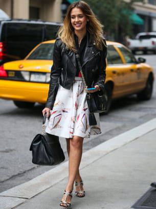 Jessica Alba en blouson en cuir et jupe blanche imprimée