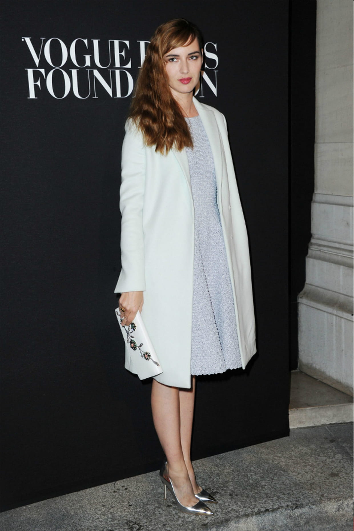 L'été 2014 n'était pas des plus ardents, et pour assister au Gala de la Vogue Paris Foundation au mois de juillet, Louise Bourgoin surmontait sa petite robe bleu ciel d'un manteau immaculé au toucher ultra doux. Les accessoires étaient cependant les stars de sa tenue : avec une paire d'escarpins métallisés et une pochette brodée de fleurs, l'actrice offrait un look pointu en parfait accord avec l'événement.
