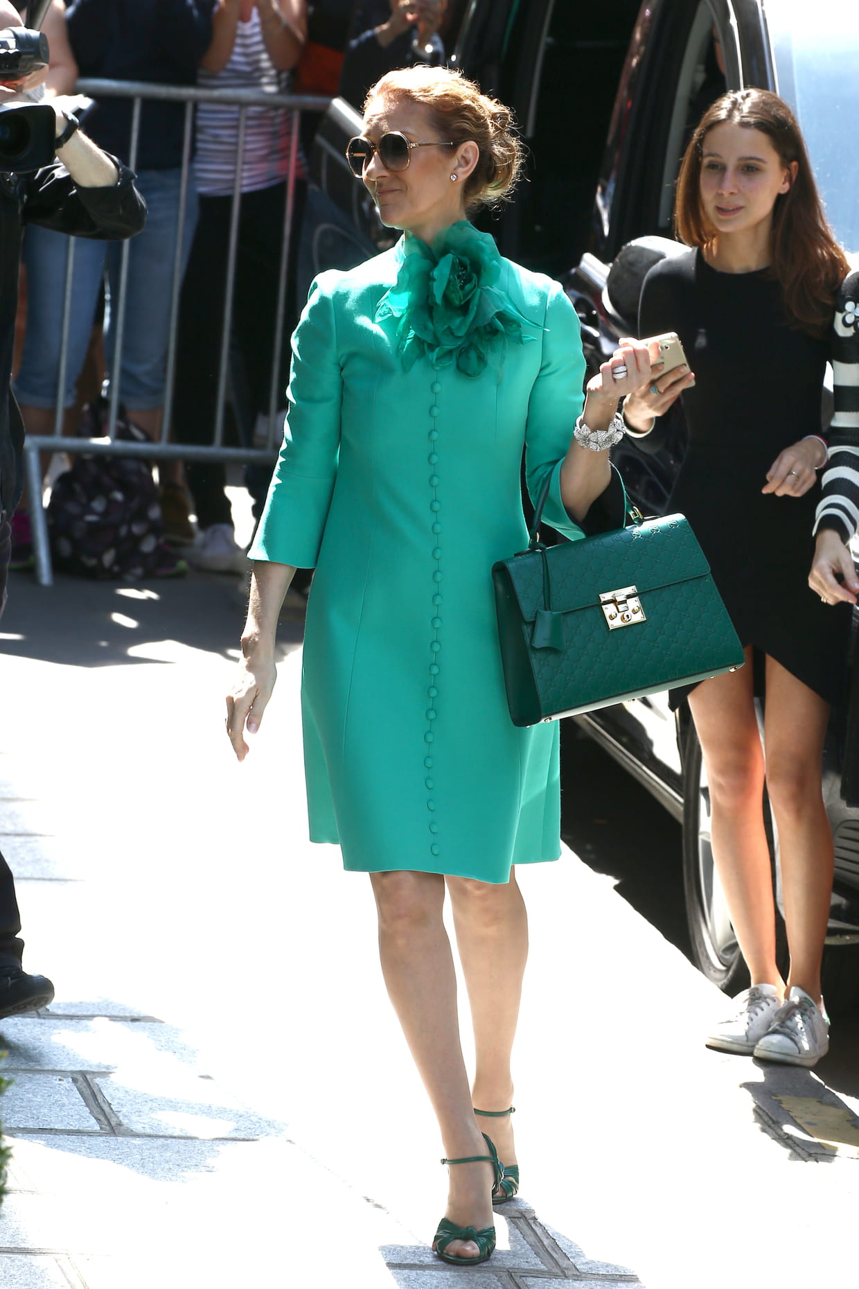 Céline Dion en robe vert émeraude et sandales à brides assorties
