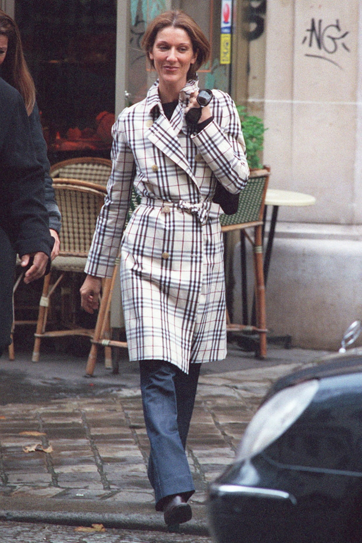 Céline Dion en trench à carreaux et jean droit dans les rues de Paris le 23 juin 2000.