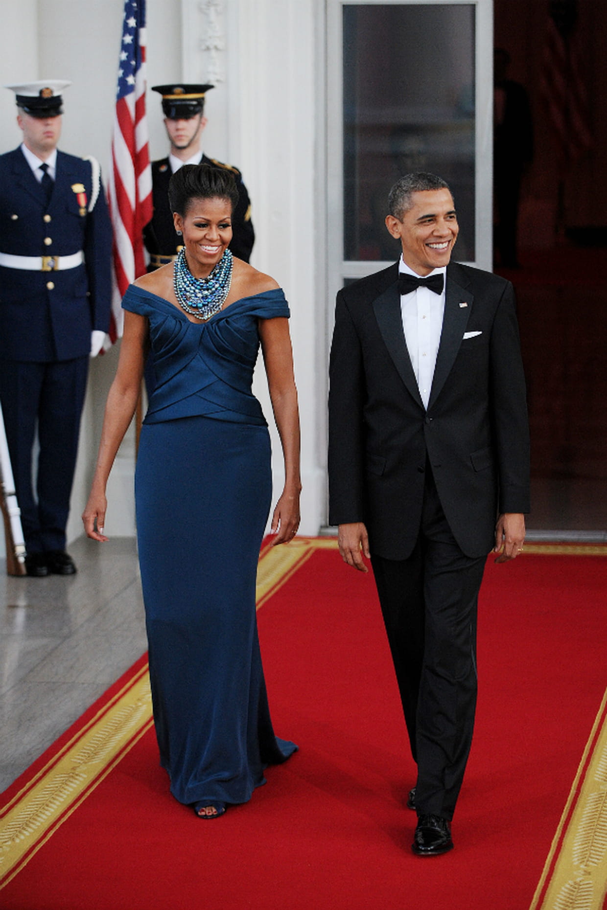 Michelle Obama en robe sirène avec Barack Obama à la Maison-Blanche à Washington le 14 mars 2014.