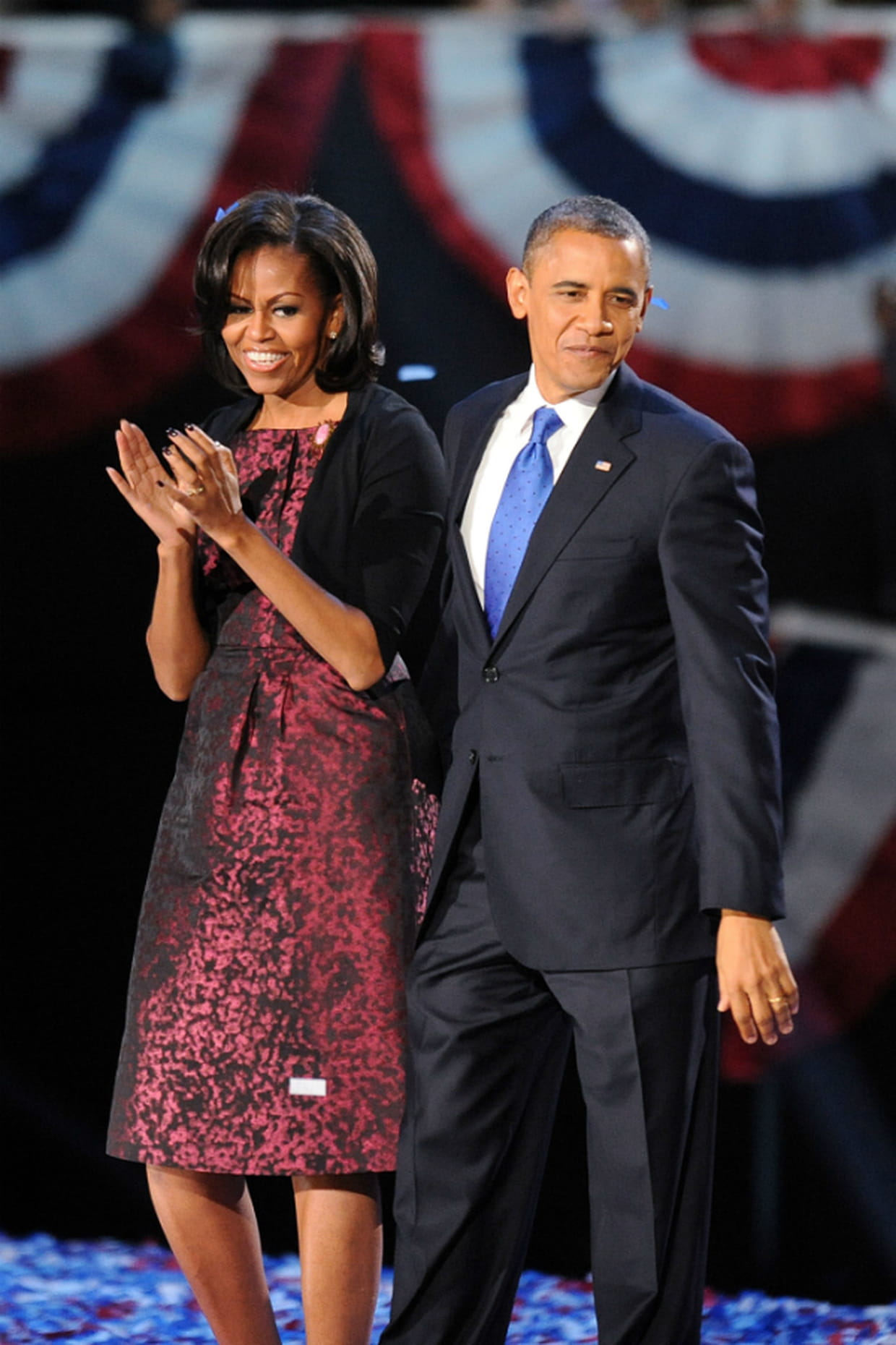 Michelle Obama en robe rouge après la réélection de son mari à la tête des États-Unis à Washington le 6 novembre 2012.