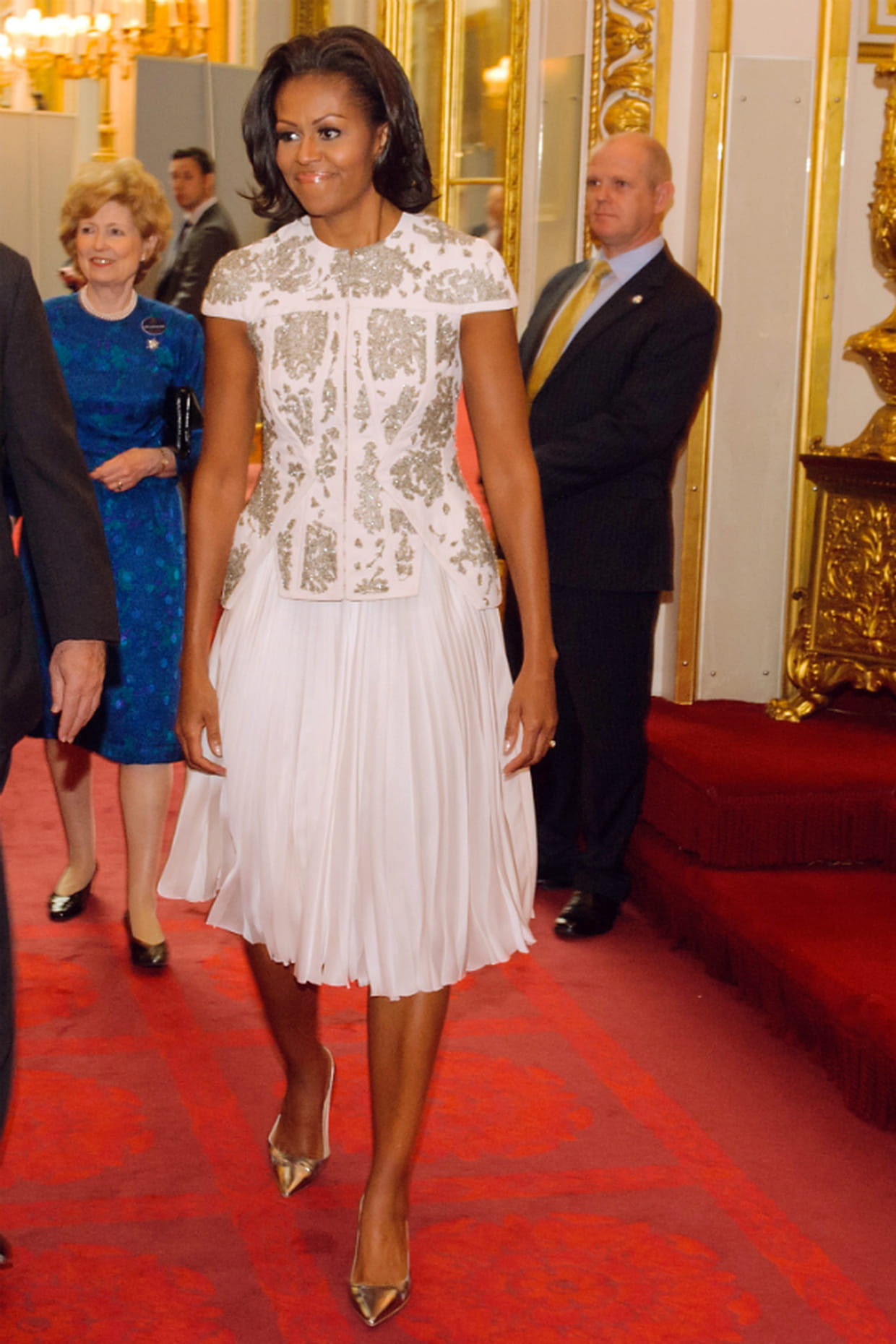 Michelle Obama en robe blanche J.Mendel lors d'une récéption à Buckingham Palace à Londres le 27 juillet 2012.