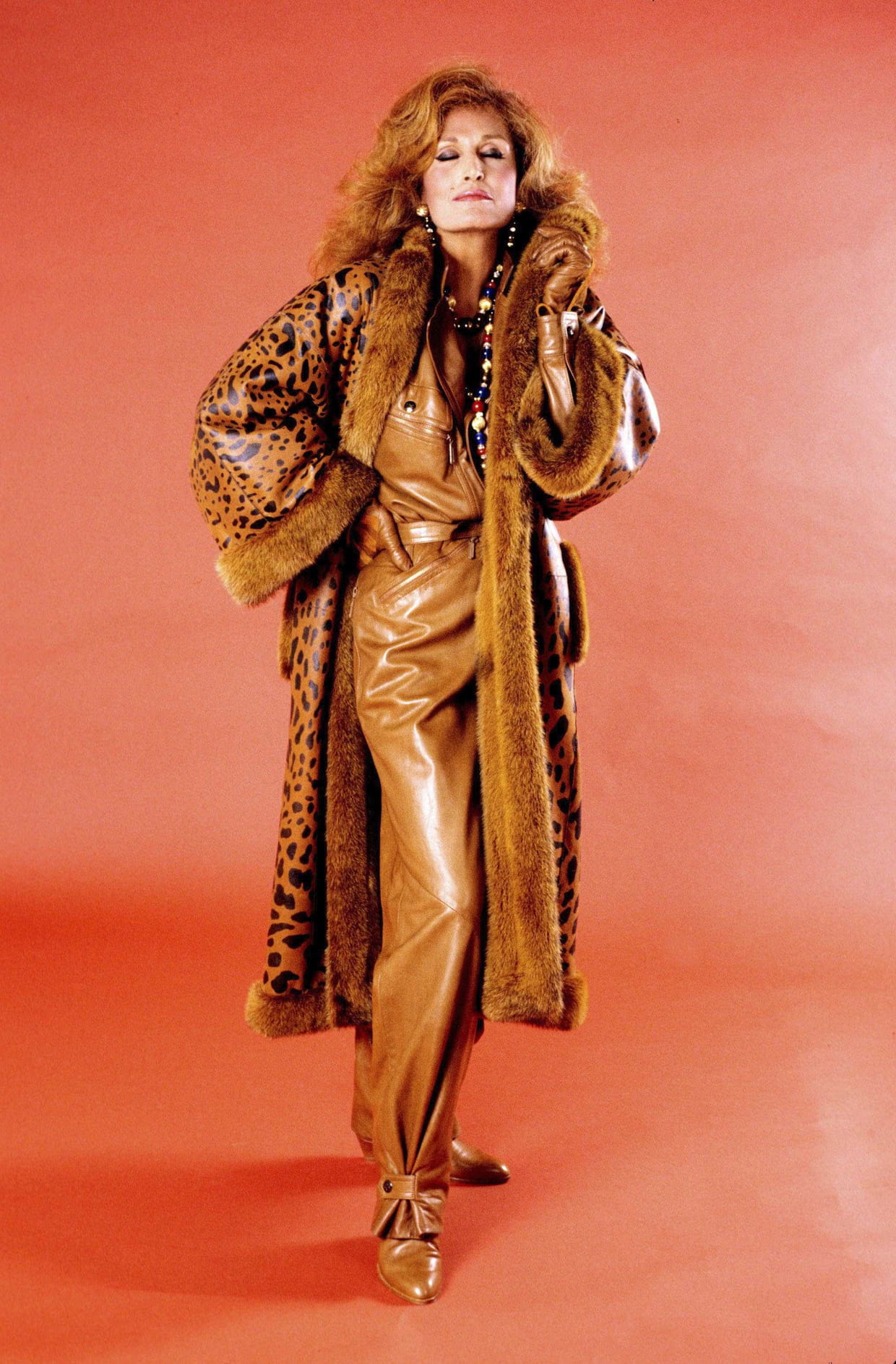 Dalida en manteau fourrure et cuir vernis imprimé léopard