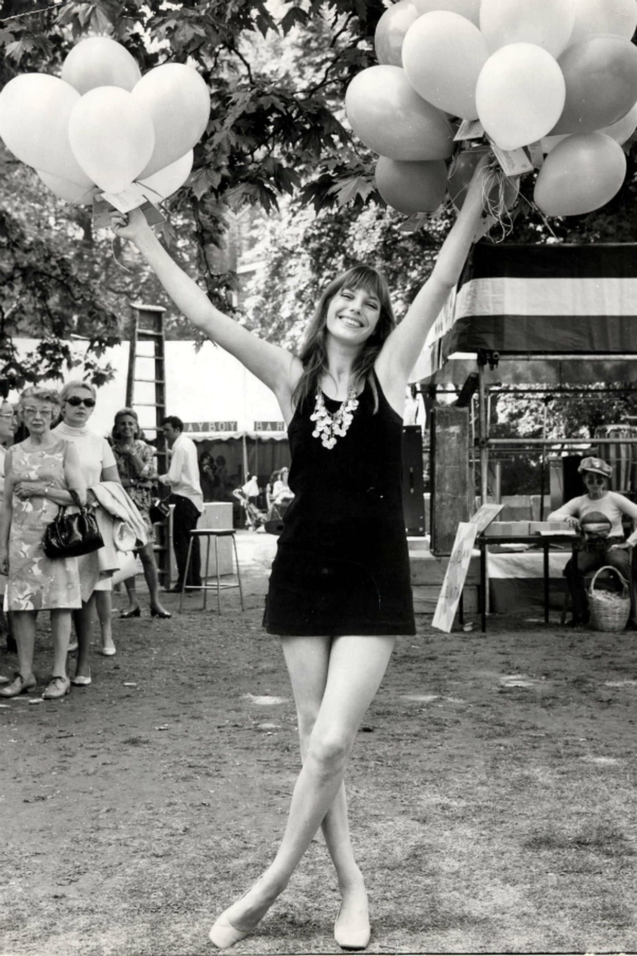 Jane Birkin en mini robe noire typique du Swinging London à un gala de charité pour une association d'aide aux enfants invalides en 1970.