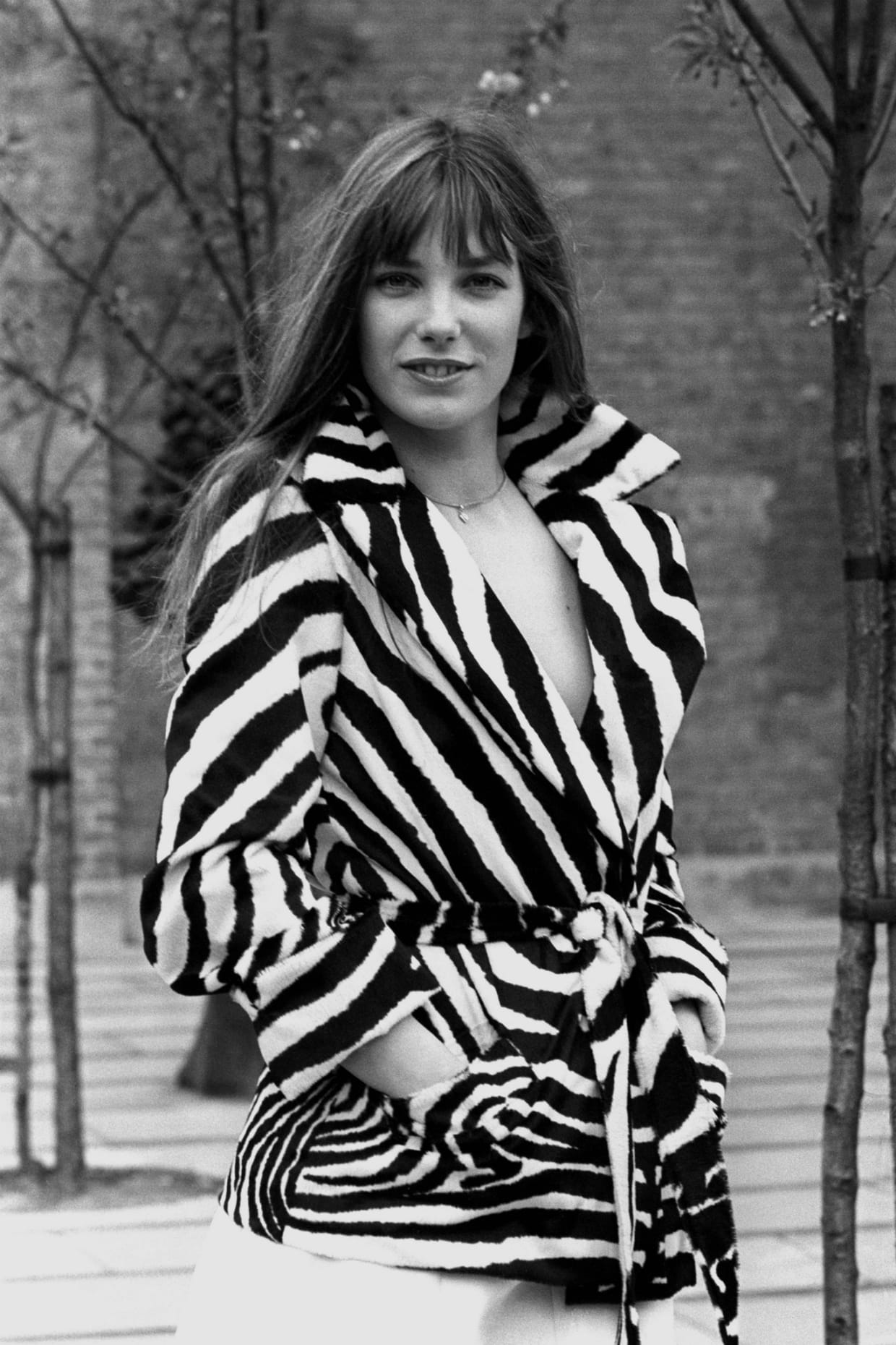 Jane Birkin en veste zébrée nouée à la taille en 1973.