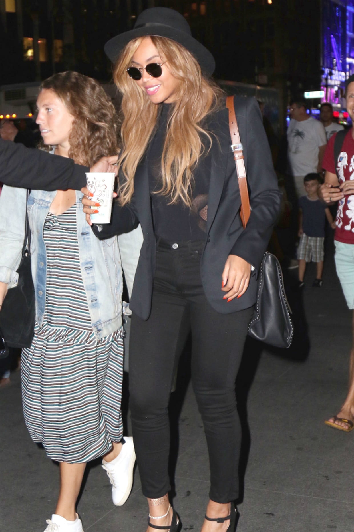 Beyoncé en blazer et slim noirs à New York le 15 juillet 2015.