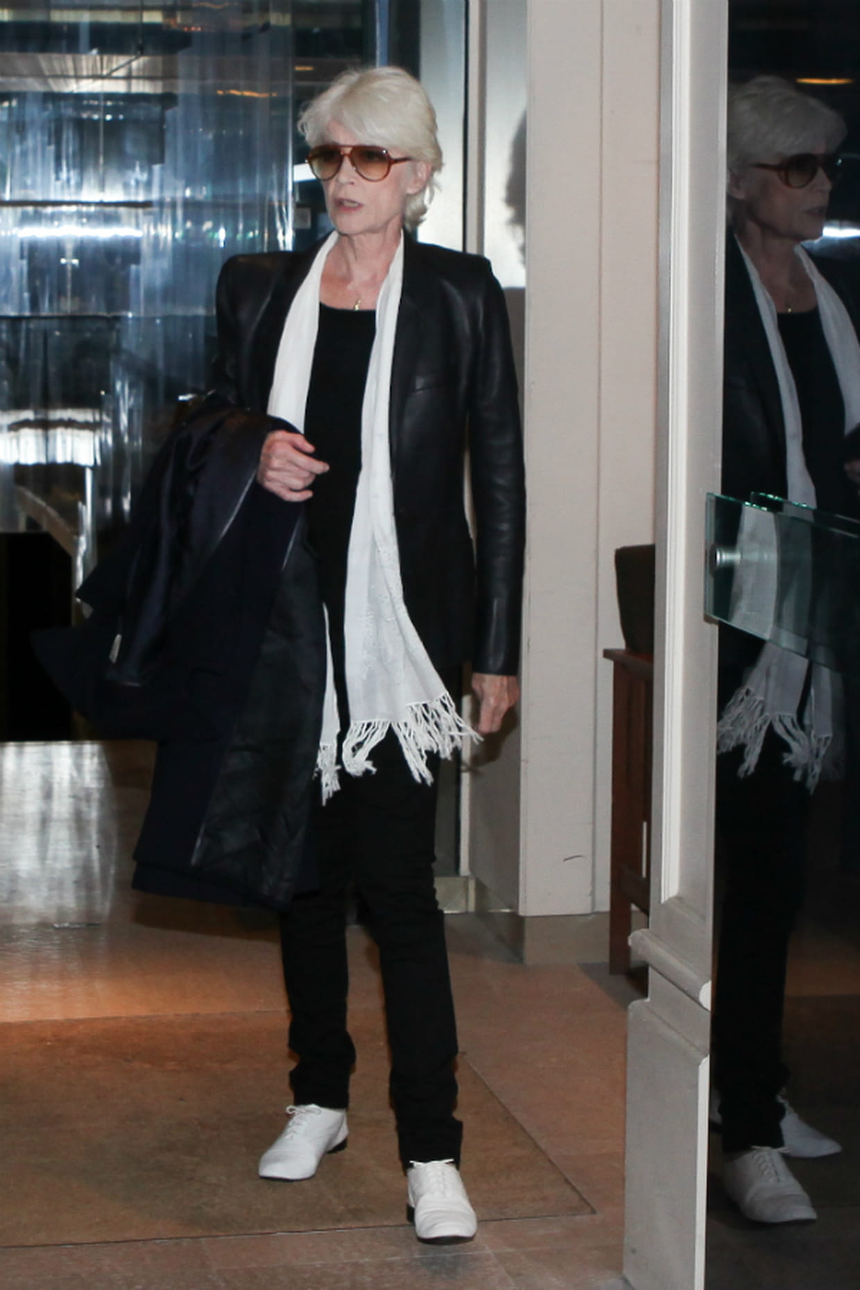 Françoise Hardy en tenue black & white arrivant à l'enregistrement de l'émission Vivement dimanche à Paris le 24 septembre 2013.