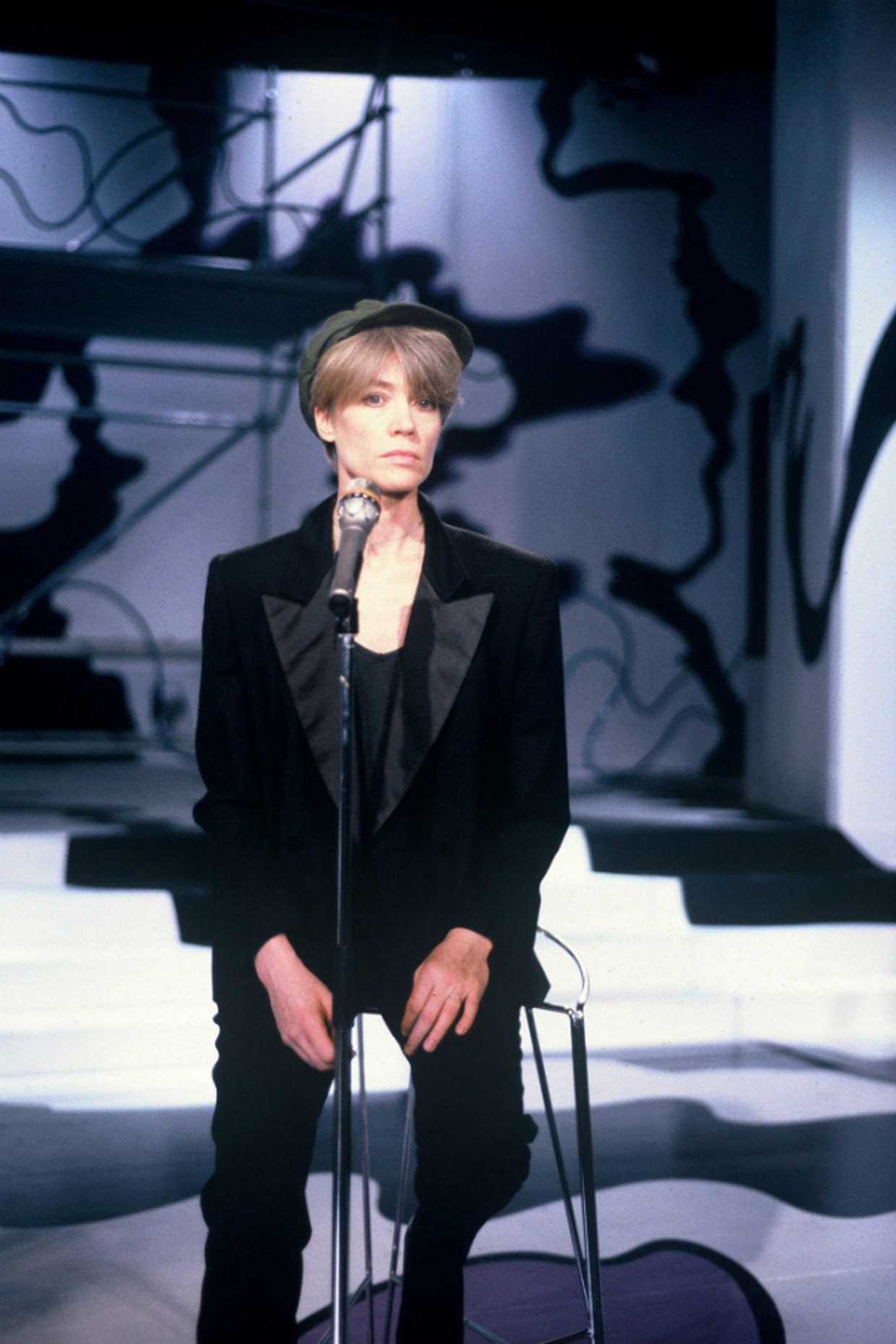 Françoise Hardy en smoking noir sur le plateau de l'émission Champs-Élysées le 21 février 1990.