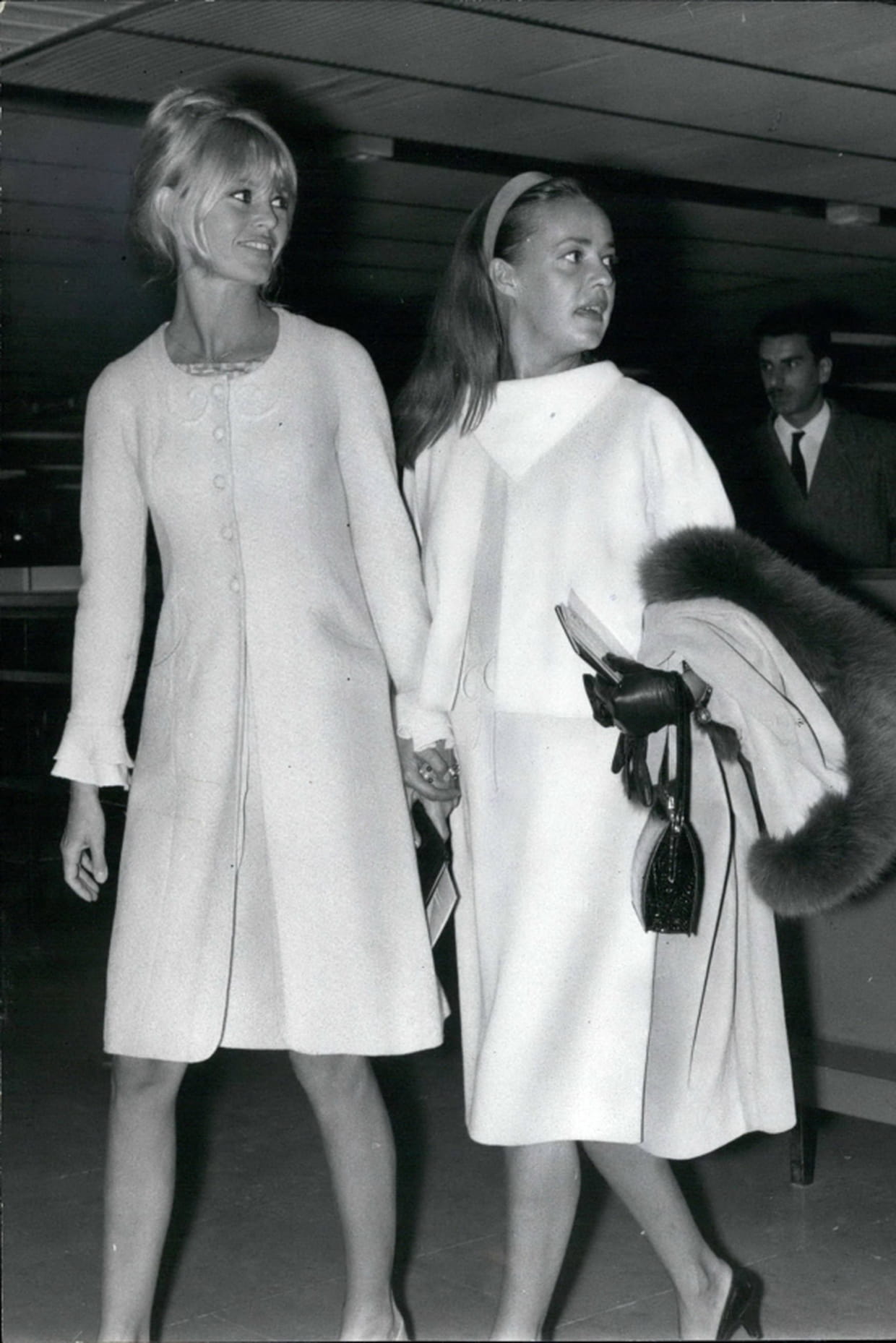 Brigitte Bardot en robe blanche cintrée avec Jeanne Moreau à l'aéroport d'Orly le 9 mai 1965.