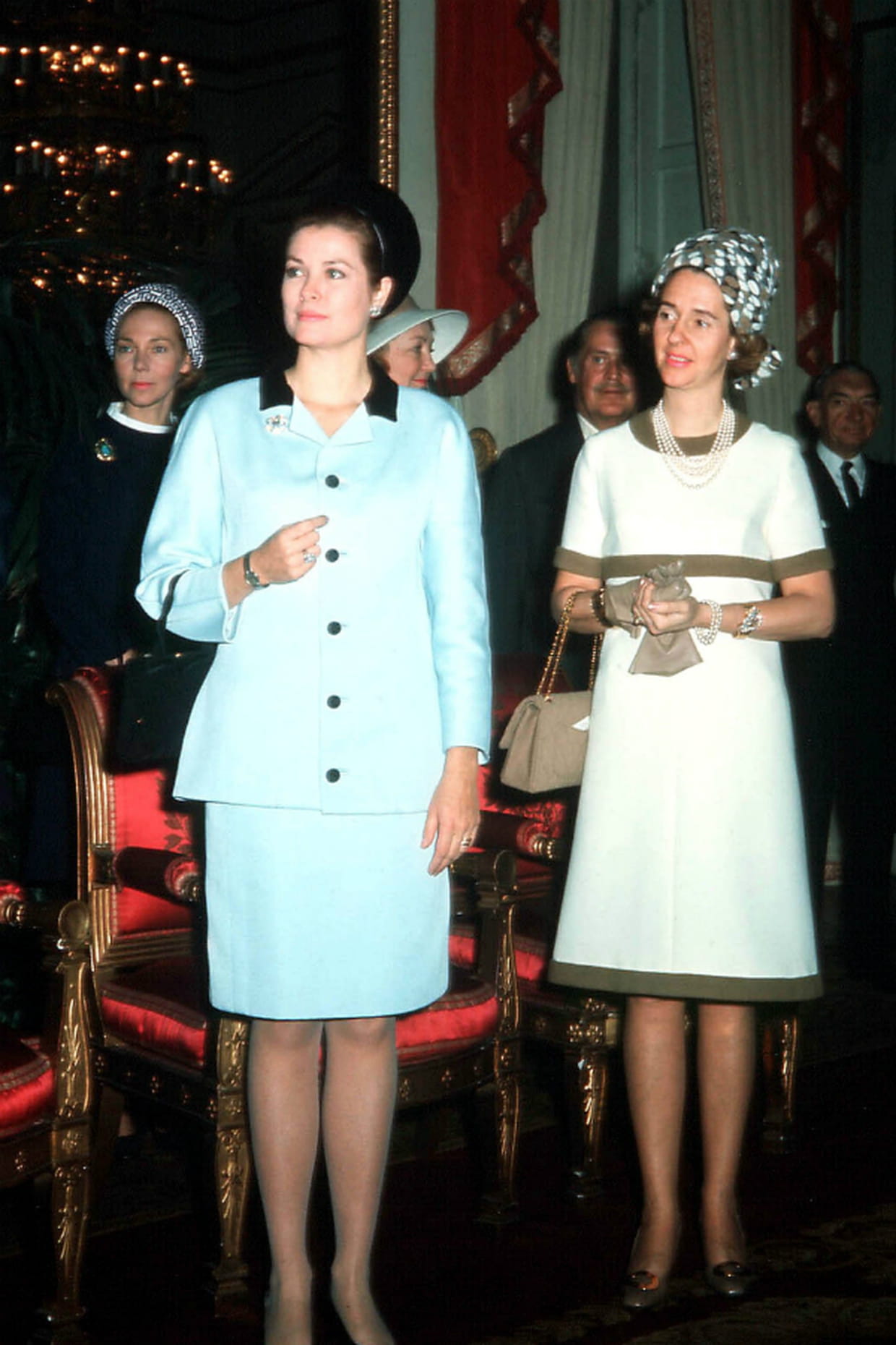 Grace Kelly en tailleur bleu ciel lors d'une rencontre avec la reine Fabiola au palais royal de Bruxelles en 1968.