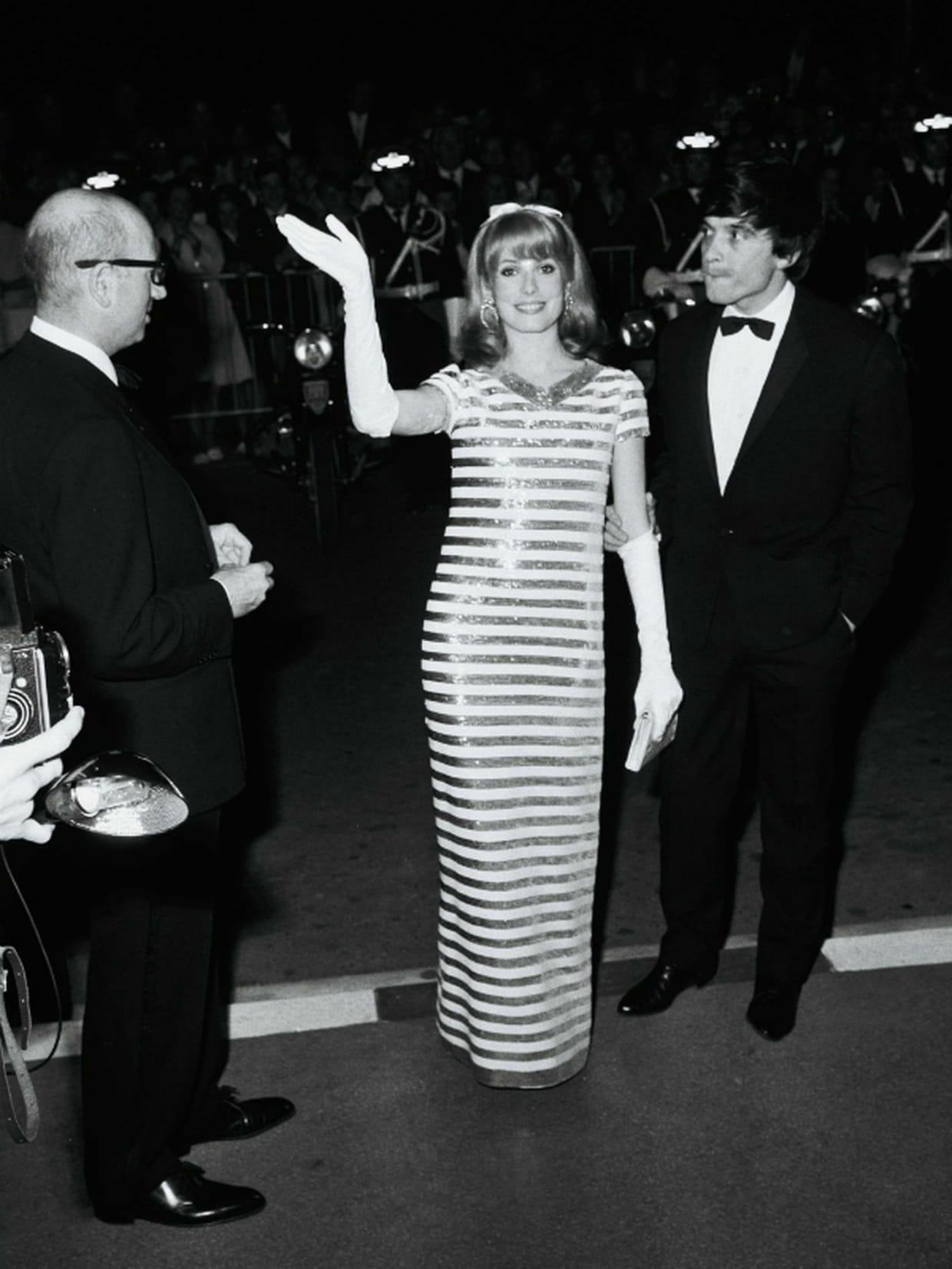 Catherine Deneuve en robe à rayures lamée au 19ème Festival de Cannes en mai 1966.