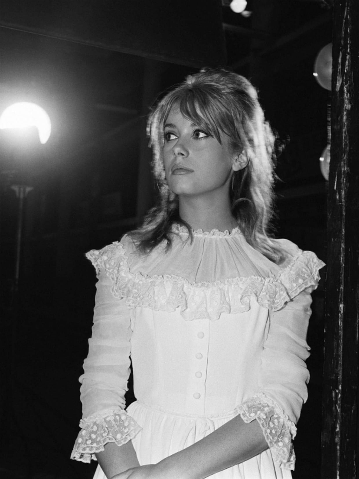 Catherine Deneuve en robe blanche romantique lors d'un shooting photo en 1963.