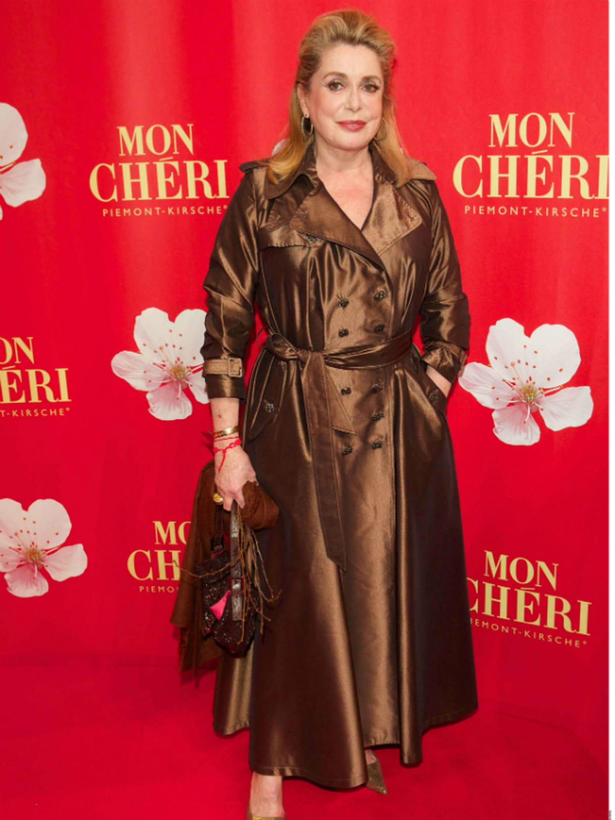 Catherine Deneuve en robe trench cuivrée
